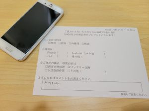 スマホスピタル練馬 AQUOS Rバッテリー交換修理のお客様からコメントをいただきました
