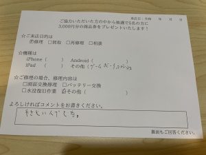 スマホスピタル練馬 ゲーム機修理のお客様からコメントをいただきました。