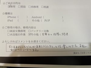 スマホスピタル練馬 PSPを修理のお客様からコメントをいただきました。