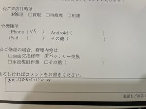 スマホスピタル練馬 iPhone11Proバッテリー交換のお客様からコメントをいただきました。