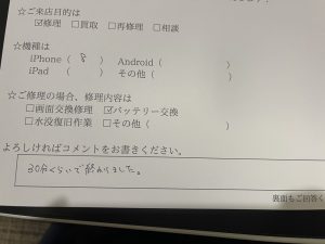 スマホスピタル練馬 iPhone8バッテリー交換のお客様からコメントをいただきました。