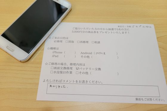 AQUOS Rバッテリー交換修理のお客様からコメントをいただきました