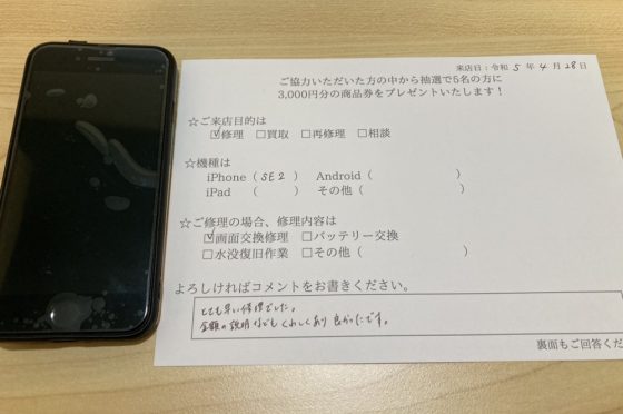 iPhone SE2画面交換のお客様からコメントをいただきました