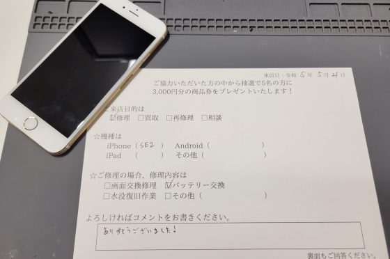 iPhone SE2のバッテリー交換のお客様からコメントをいただきました