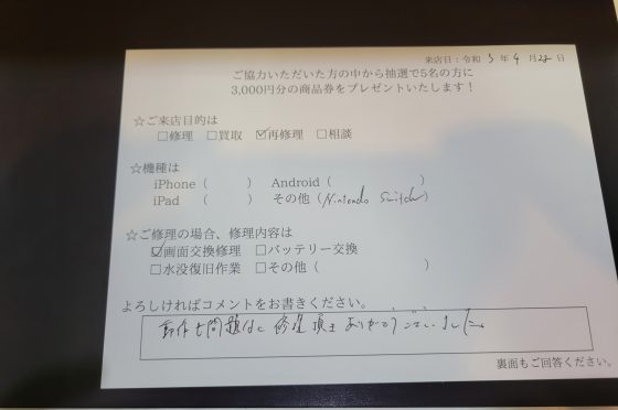 Switchの液晶交換修理のお客様からコメントをいただきました