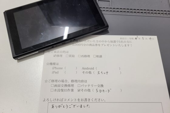 SwitchのSDカードスロット交換修理のお客様からコメントをいただきました