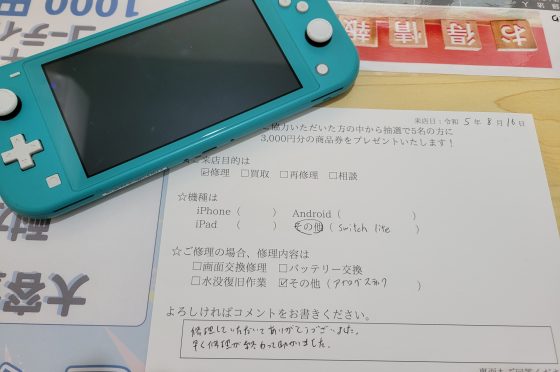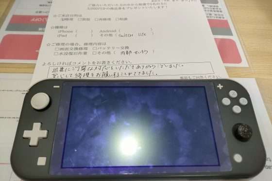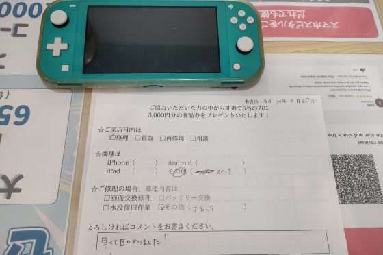 任天堂Switch Liteの修理のお客様からコメントをいただきました。