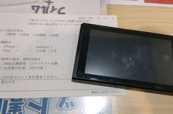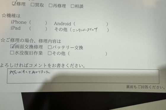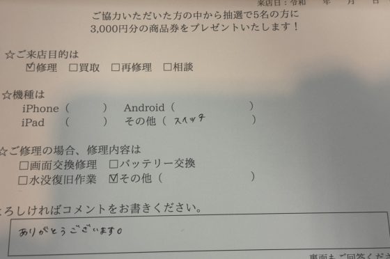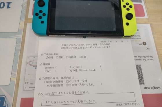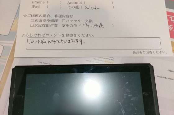 任天堂Switchの修理のお客様からコメントをいただきました。