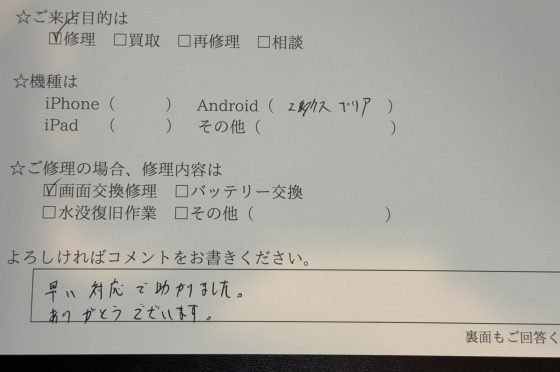 Xperia XZ1の修理のお客様からコメントをいただきました。