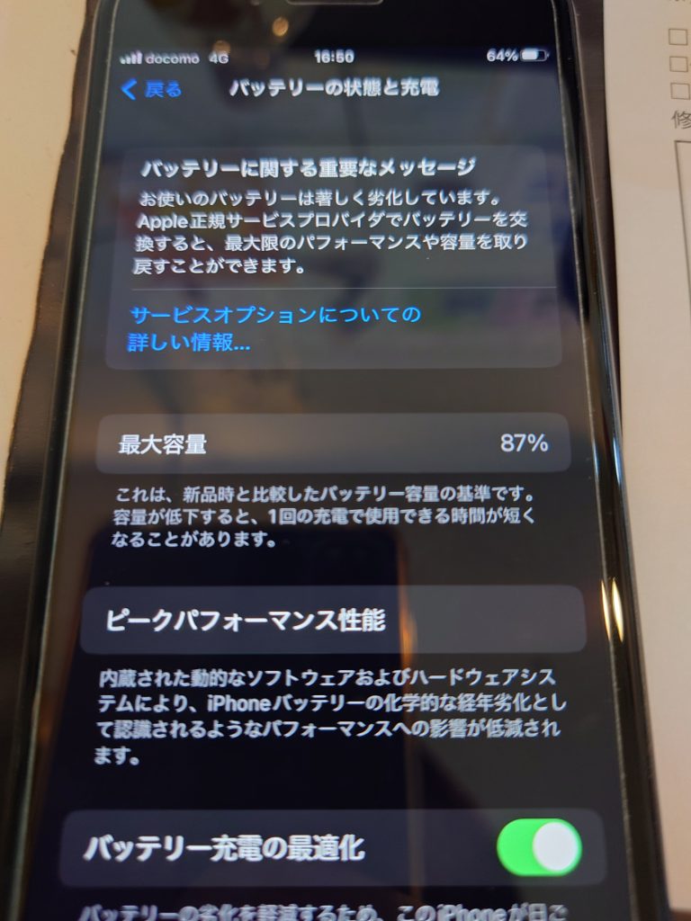 お持ちいただいたiPhoneSE(第二世代)はバッテリー容量は87%でした。