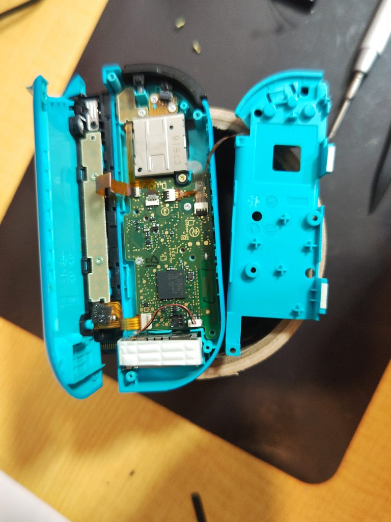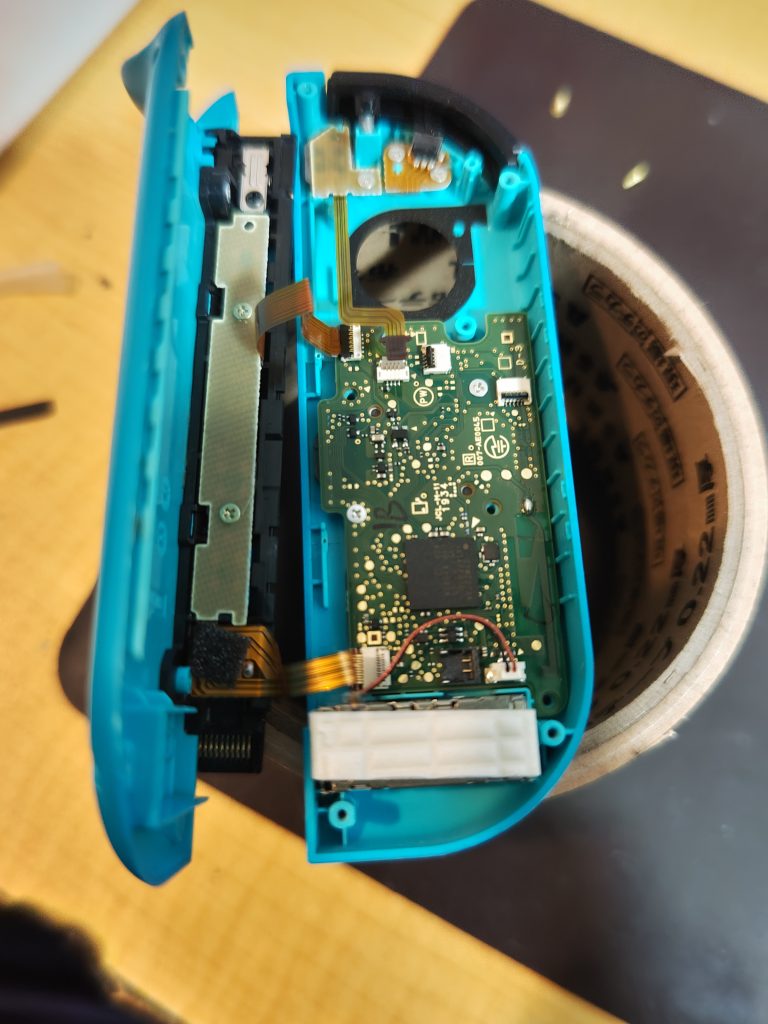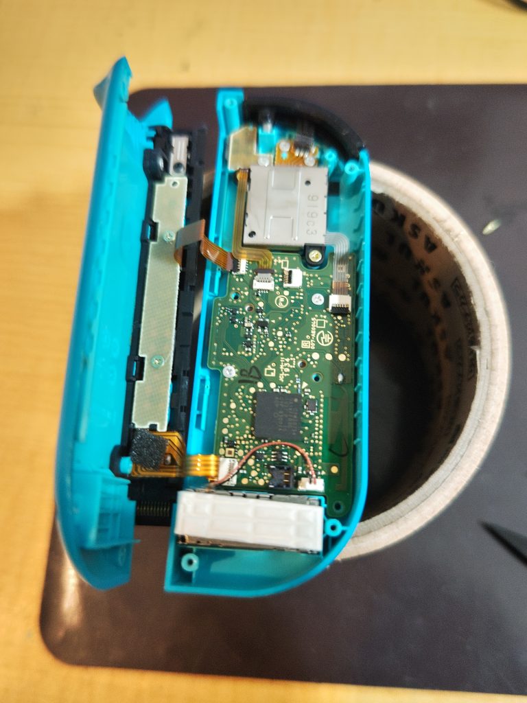左右に開かれているそれぞれのフレームからは真ん中の基板パーツへZLボタンやJoy-Conのレール部分の反応を伝えるケーブルが伸びています。
