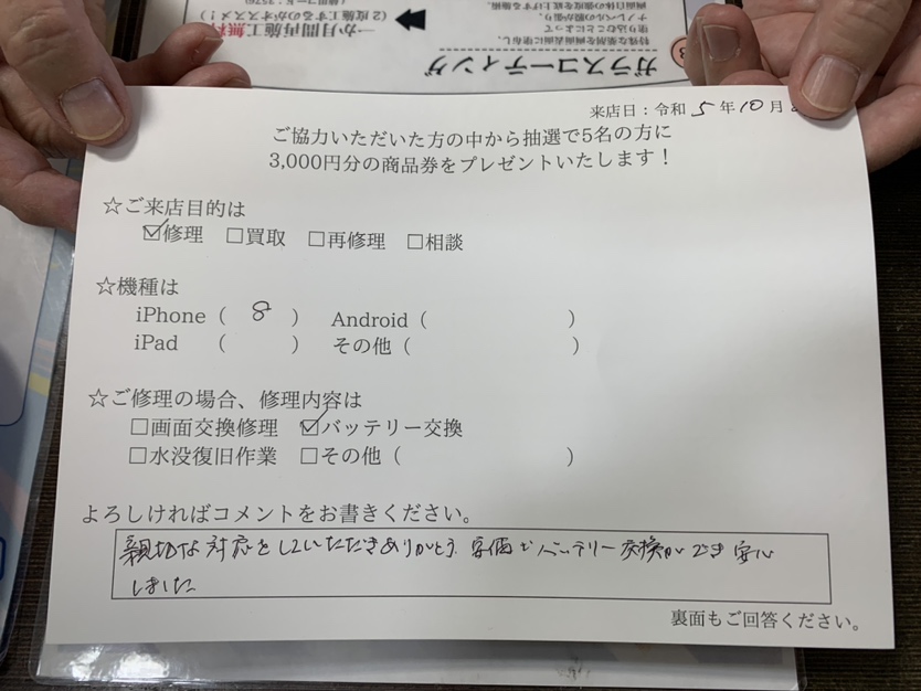 親切な対応をしていただきありがとう。安価でバッテリー交換ができ安心しました。