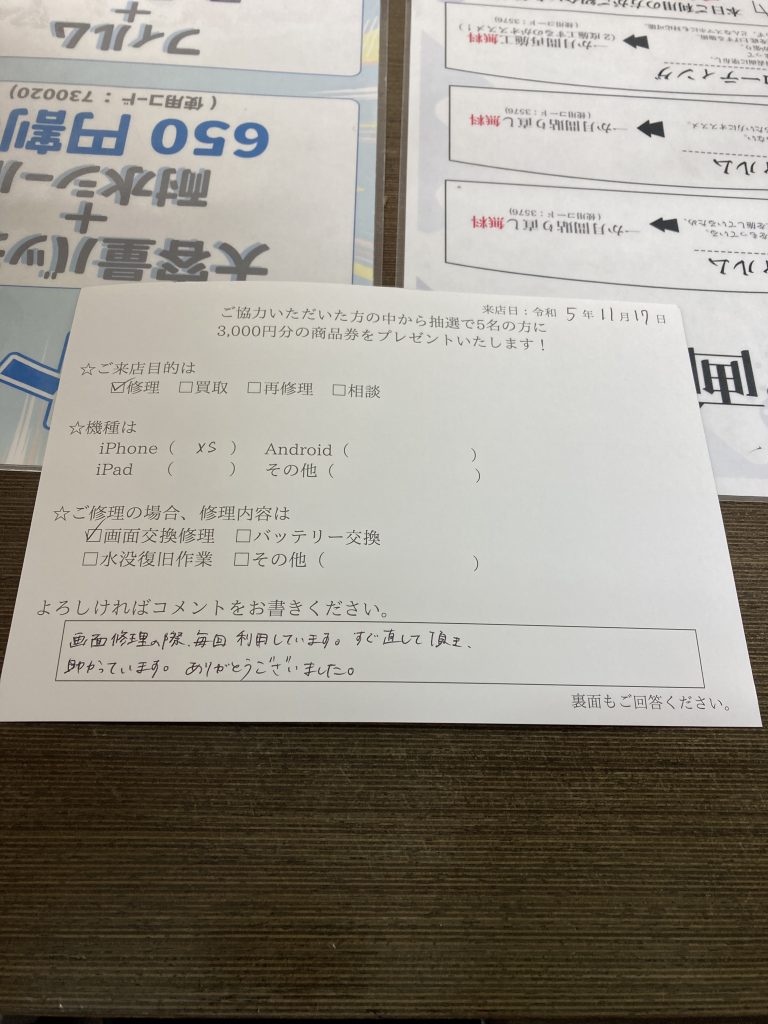 画面修理の際、毎回利用しています。すぐ直して頂き、 助かっています。ありがとうございました。 (コメントより抜粋)