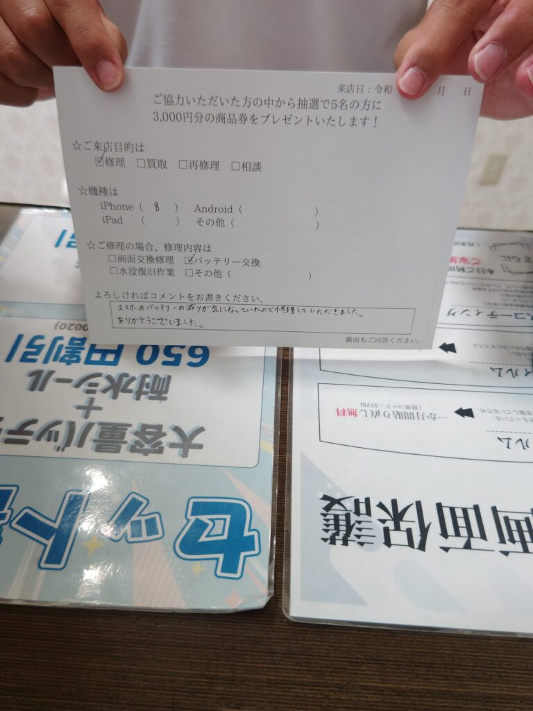 スマホのバッテリーの減りが気になっていたので修理して頂きました。 ありがとうございました。 (コメントより抜粋)