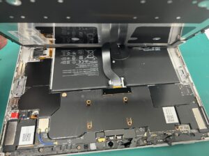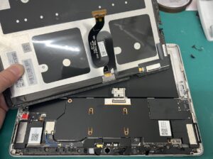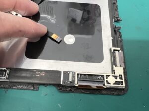 画面は本体と両面テープで止められているので、周りの粘着を剥がしてから中央のフレキケーブルの接続を外していきます。