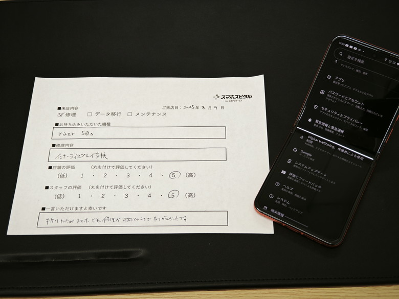 スマホスピタル 大森 motorola razr 50sの画面交換修理のお客様からコメントを頂きました
