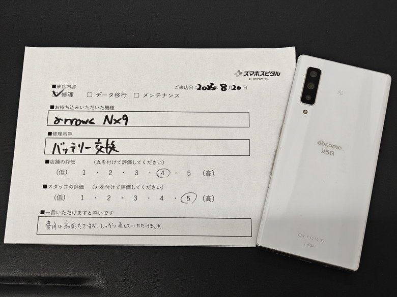 スマホスピタル 大森 arrows NX9のバッテリー交換修理のお客様からコメントを頂きました