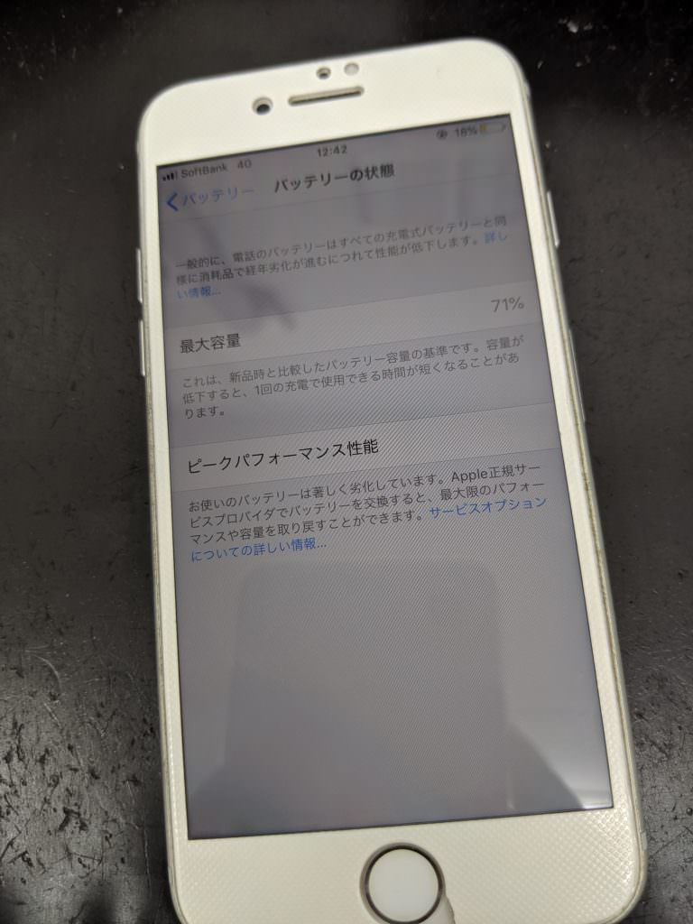 さて、今回お預かりしたiPhone 7はバッテリー最大容量が71%になっておりました。