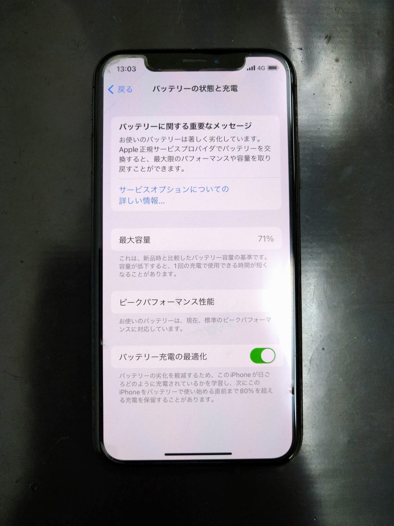 今回お客様が持ち込まれた端末は最大容量が71%まで低下してます。