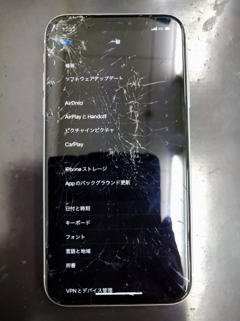 修理前のiPhone XRは上記写真のように画面全体がバキバキに割れてしまっている状態でした。