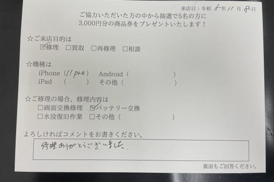【お客様の声】iPhone11Proのバッテリー交換修理をさせて頂きました!