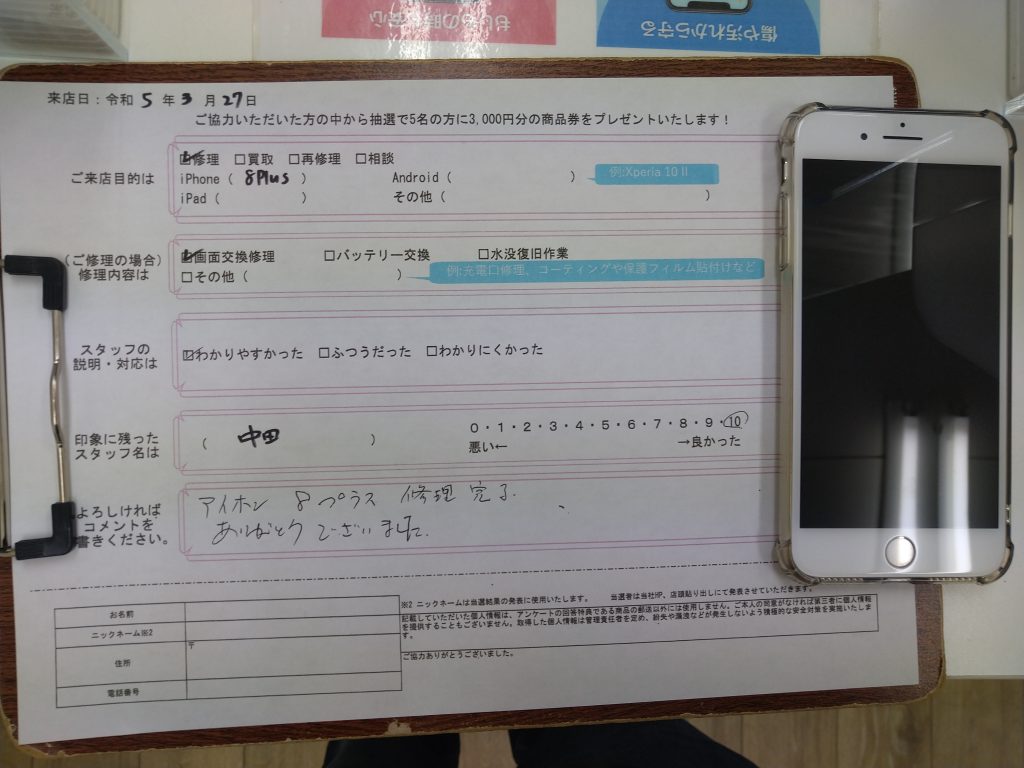 iPhone 8Plus修理完了、 ありがとうございました。 (コメントより抜粋)