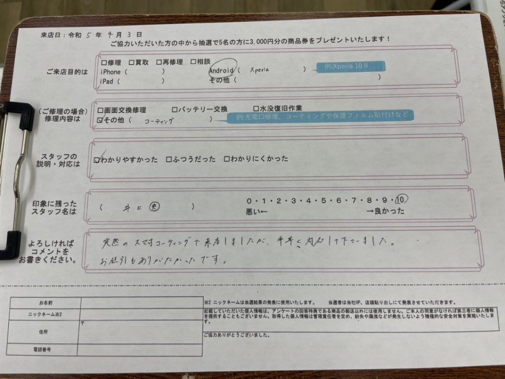 突然のスマホコーティングで来店しましたが、手早く対応して下さいました。 お値引もありがたかったです。 (コメントより抜粋)
