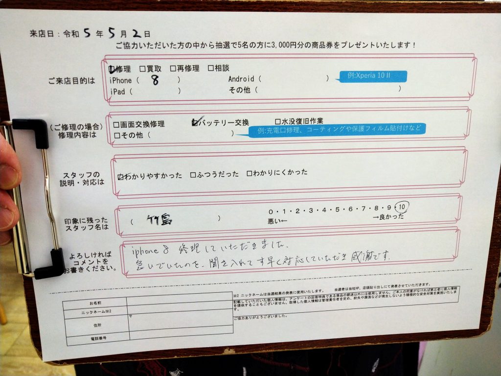 スマホスピタル大阪駅前第4ビル 【お客様の声】iPhone 8のバッテリー交換をさせて頂きました!