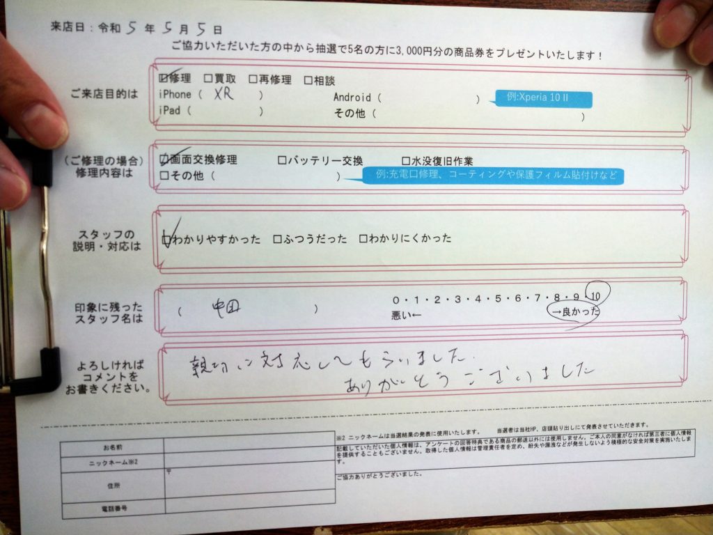 親切に対応してもらいました。 ありがとうございました。 (コメントより抜粋)