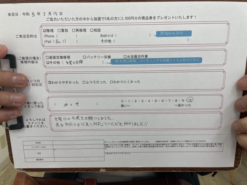 充電口の交換をお願いしました。 急な対応にもこころよく対応していただき助かりました!! (コメントより抜粋)