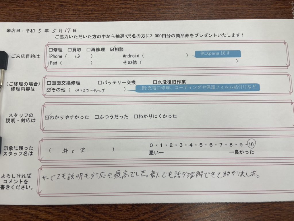 スマホスピタル大阪駅前第4ビル 【お客様の声】iPhone 13 ガラスコーティングをさせて頂きました!