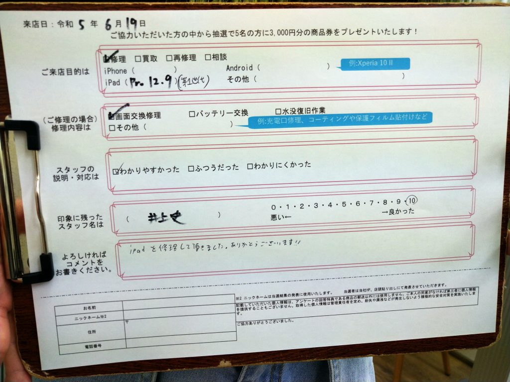 iPadを修理して頂きました。ありがとうございます!! (コメントより抜粋)
