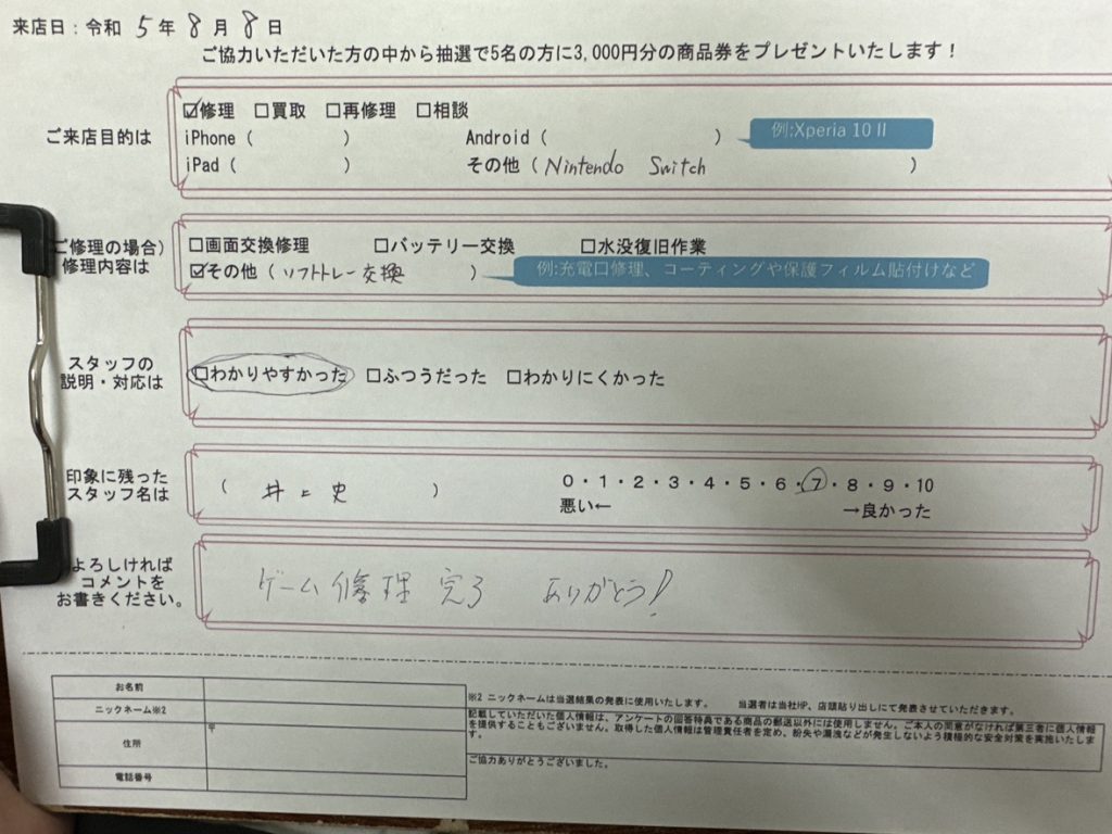 ゲーム修理 完了 ありがとう! (コメントより抜粋)