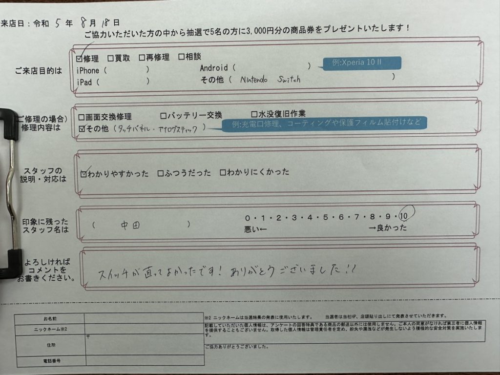 スマホスピタル大阪駅前第4ビル 【お客様の声】Nintendo Switchのアナログスティックとタッチパネルの交換をさせて頂きました!!