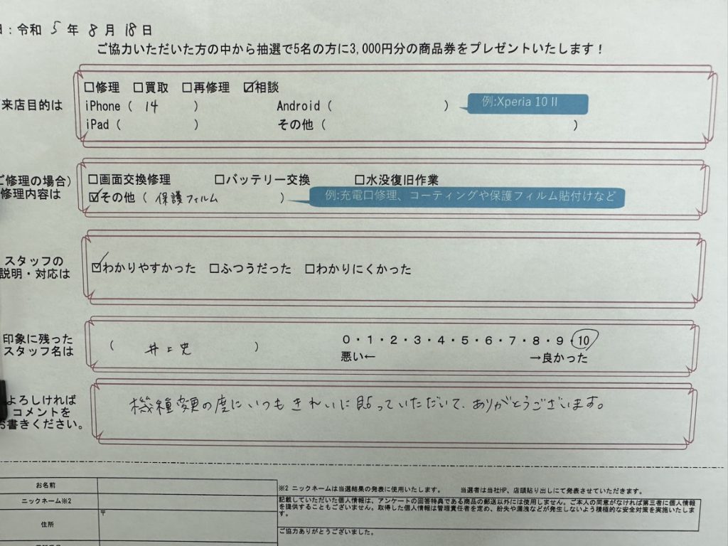 スマホスピタル大阪駅前第4ビル 【お客様の声】iPhone 14 衝撃吸収フィルムをお貼りさせて頂きました!