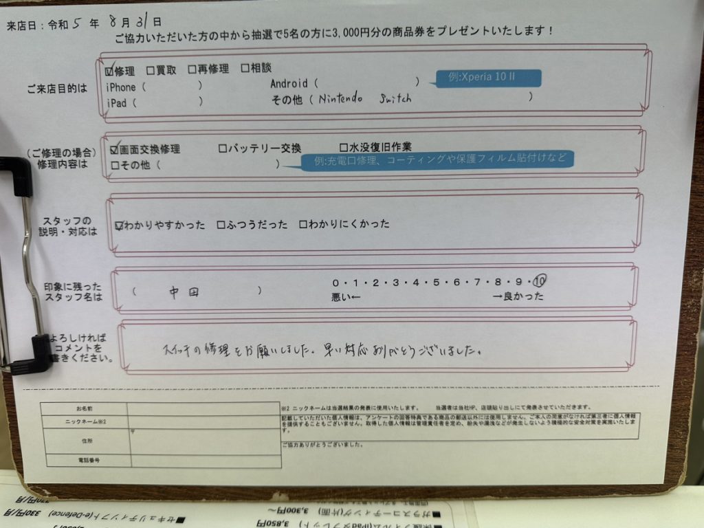 スマホスピタル大阪駅前第4ビル 【お客様の声】Nintendo Switch の液晶交換修理をさせて頂きました!