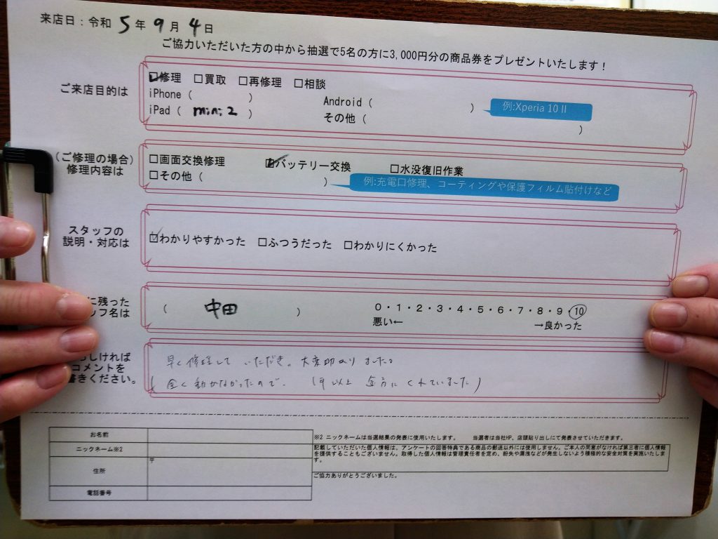 スマホスピタル大阪駅前第4ビル 【お客様の声】iPad mini2のバッテリー交換修理をさせて頂きました!