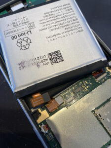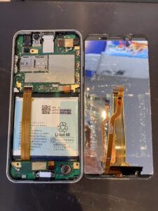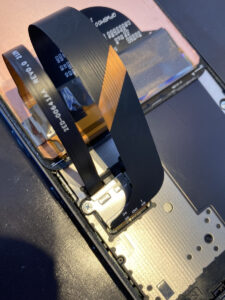 画面パーツを分解し、様々なケーブルの抜き差しをしながらバッテリーを交換します。