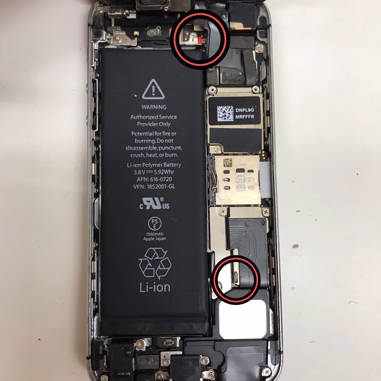 iPhone5sはホームボタンのコネクターが画面側からバッテリー下の基板に