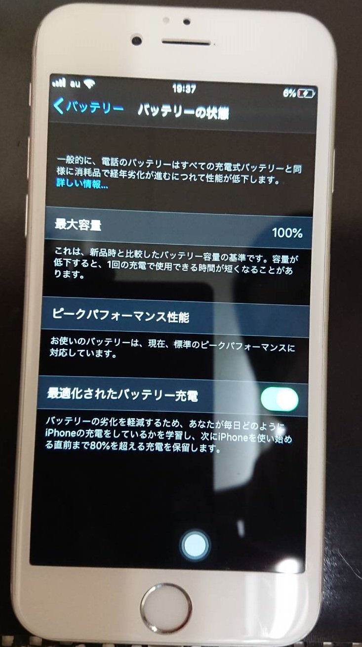 修理後のiPhone 6sを手に取られ最大容量が100%に改善されたのを確認されたお客様は安堵の表情をされていました。
