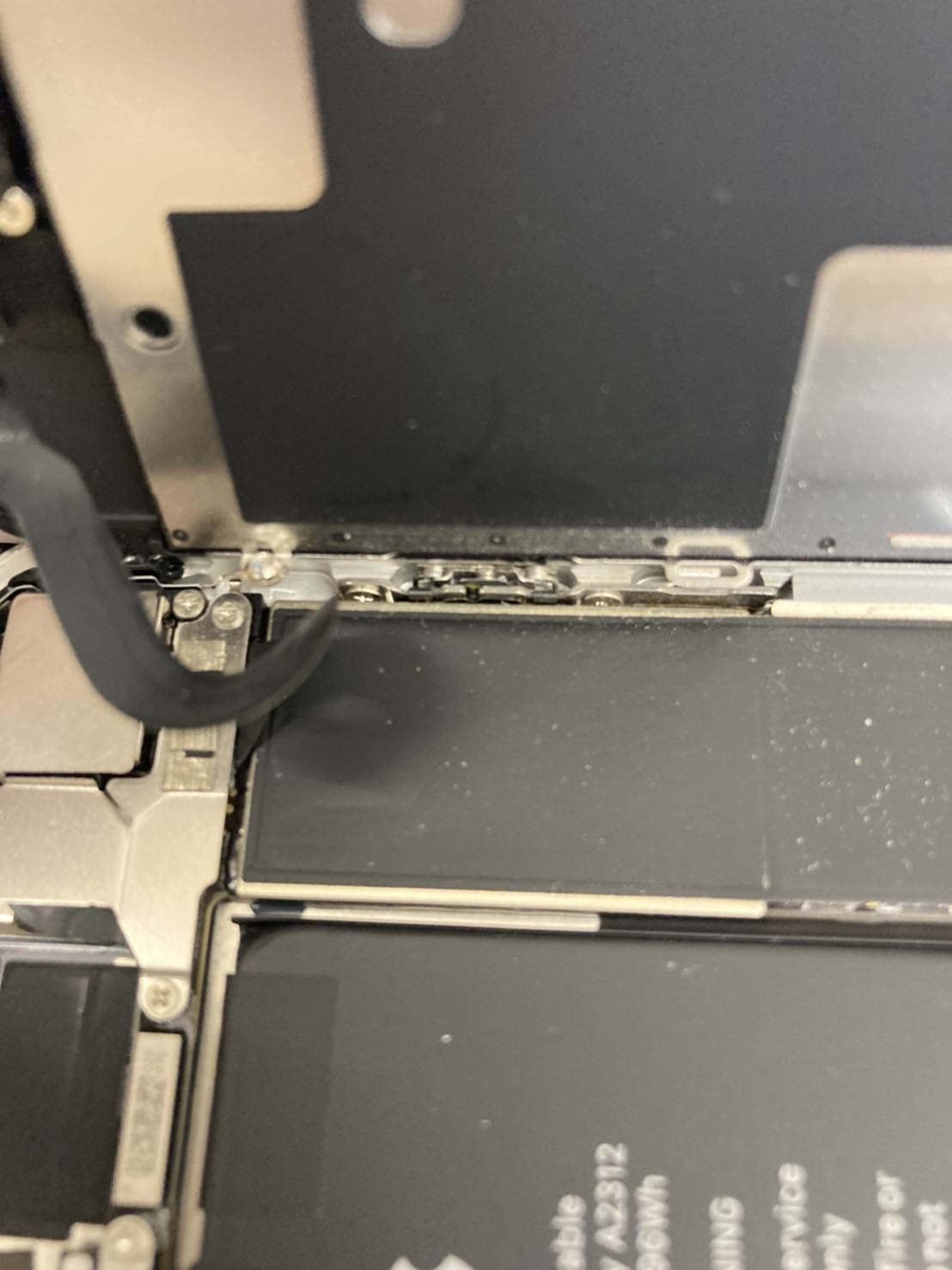画面を開きコネクター部分を覆う金属プレートを取り外したら、まずバッテリーの接続を解除し画面の取り外しを行います。