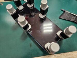 最終的に接着を安定させるため、専用のクリップで一定時間圧着作業を行いました。