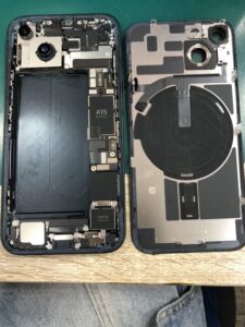 今回修理する端末iPhone14は背面から開けてバッテリーを取り外していく端末になります。