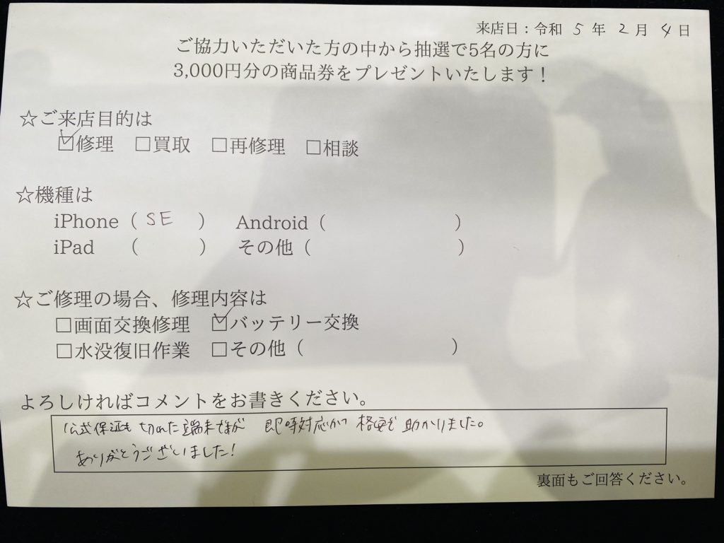 スマホスピタルイオン相模原 公式保証の切れたiPhone SEのバッテリー交換をしていただきました!