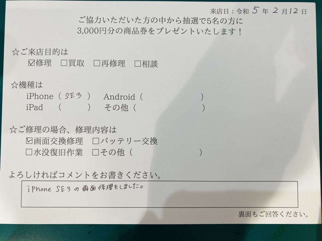 スマホスピタルイオン相模原 iPhone SE (第3世代)の画面修理をご依頼頂いたお客様よりコメントを頂きました