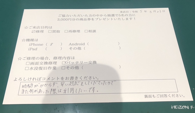 スマホスピタルイオン相模原 iPhone8のバッテリー交換ご依頼のお客様よりコメントいただきました!