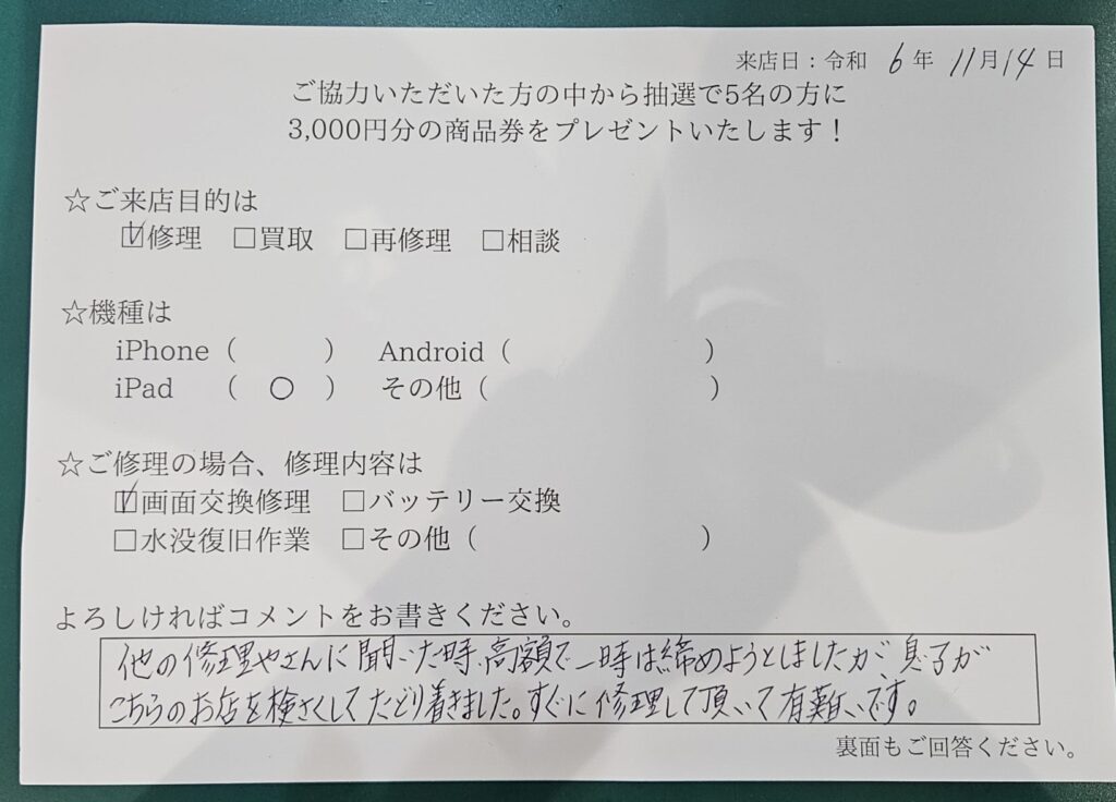 スマホスピタルイオン相模原 【iPad 9】お客様よりコメント頂きました!
