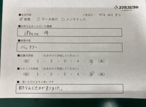 iPhone14 Pro Max バッテリー交換のお客様から頂きました