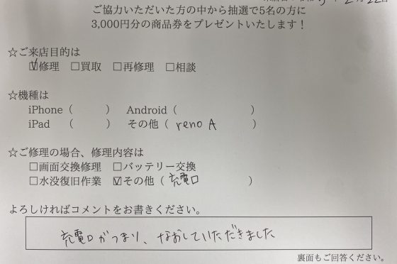 OPPO Reno Aの充電口詰まりを直して頂きました!