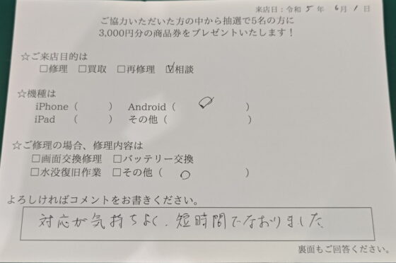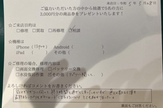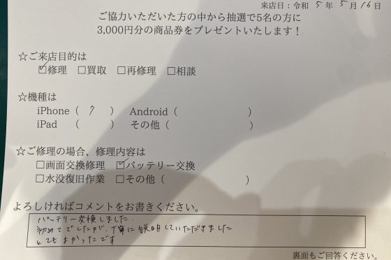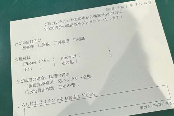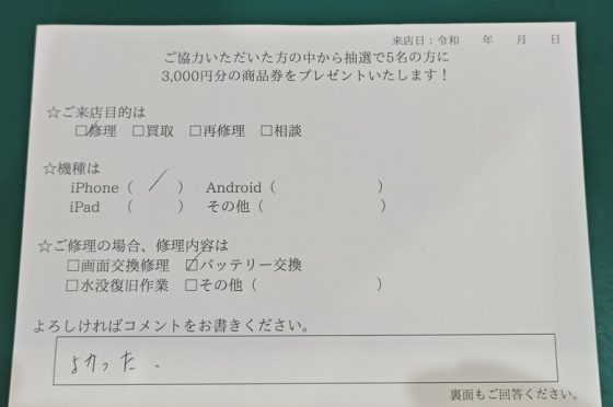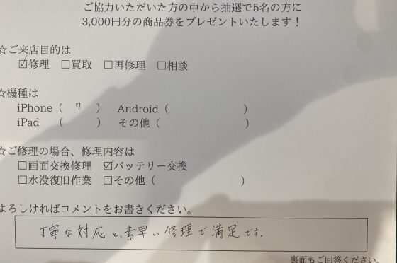iPhone SE2 バッテリー交換のお客様よりアンケート回答頂きました